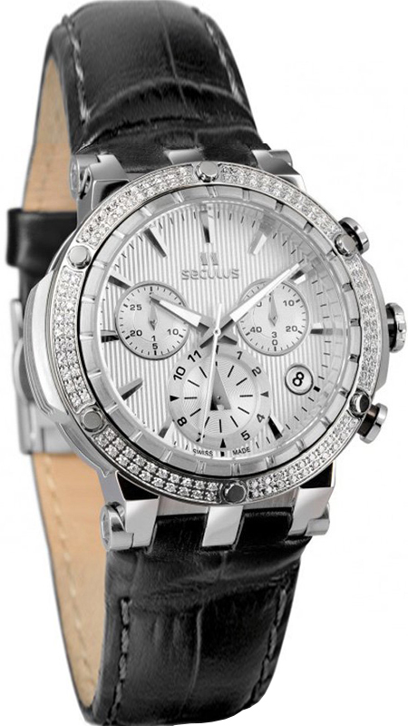 Стиль хронографа Seculus можно охарактеризовать как sport chic. За точный ход модели отвечает швейцарский кварцевый механизм Ronda, калибр 5030. Корпус сложной конструкции выполнен из нержавеющей стали. Несмотря на массивность, он хорошо ложится на запястье, благодаря эргономичной форме задней крышки. Широкий безель, усыпанный фианитами, крепится к корпусу с помощью шести граненых винтов. Роскошный многоуровневый циферблат декорирован гильоше в виде вертикальных полос. В центральной его части помещены дополнительные индикаторы хронографа: часовой, минутный и секундный накопители. В позиции «4 часа» - окошко даты. Хорошо читаемые стрелки часов и минут покрыты люминесцентным составом, который поможет определить время даже в условиях плохой видимости. Циферблат надежно защищен сапфировым стеклом. Оно стойко сопротивляется появлению микроцарапин и надолго сохраняет первоначальный внешний вид ваших часов. Повышенная водостойкость модели равна 10 атмосфер. Стальная задняя крышка закреплена на винтах. На плотный ремешок из натуральной кожи установлена застежка-бабочка с двумя фиксаторами и логотипом Seculus. Сам ремешок дополнительно крепится к корпусу специальными болтами.