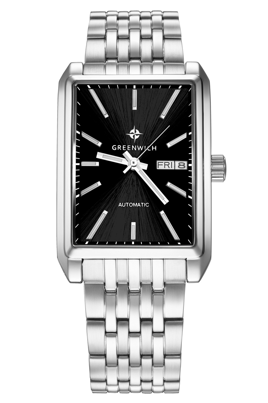 Любимая многими серия механических часов Greenwich представляет новинку: часы Caravel в элегантном прямоугольном корпусе, который скрывает японский механизм Miyota с функцией автоподзавода. Черный циферблат хорошо читается при любых условиях видимости: часовая, минутная стрелки и накладные риски покрыты люминесцентным составом, который светится в темноте. На трех часах расположено окошко даты и дня недели. Корпус сделан из нержавеющей стали, задняя крышка прозрачная — можно наблюдать за работой механизма. Браслет тоже из стали, его структуру подчеркивает чередование зеркальной полировки и матирования на звеньях. Часы серии Caravel - универсальный и стильный аксессуар, не требующий замены элемента питания.