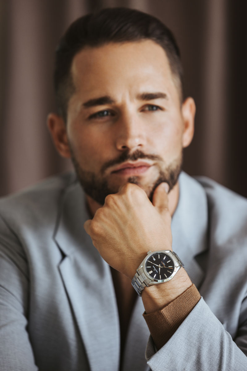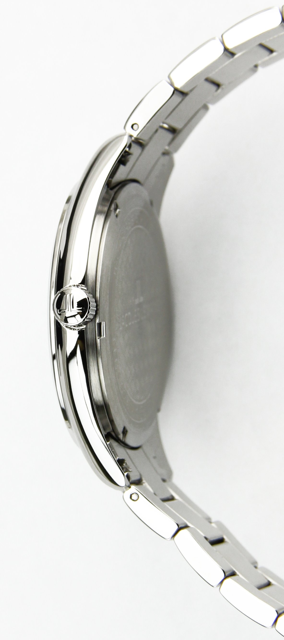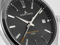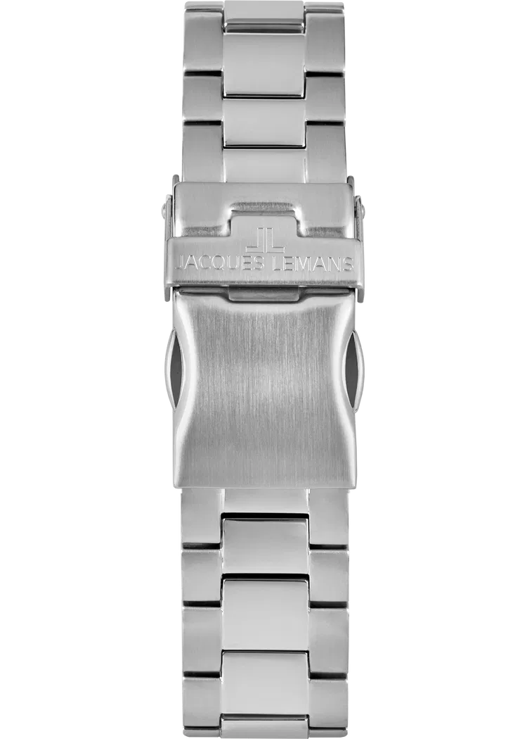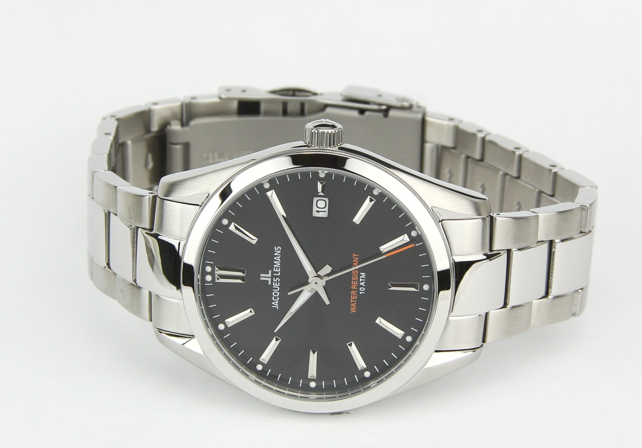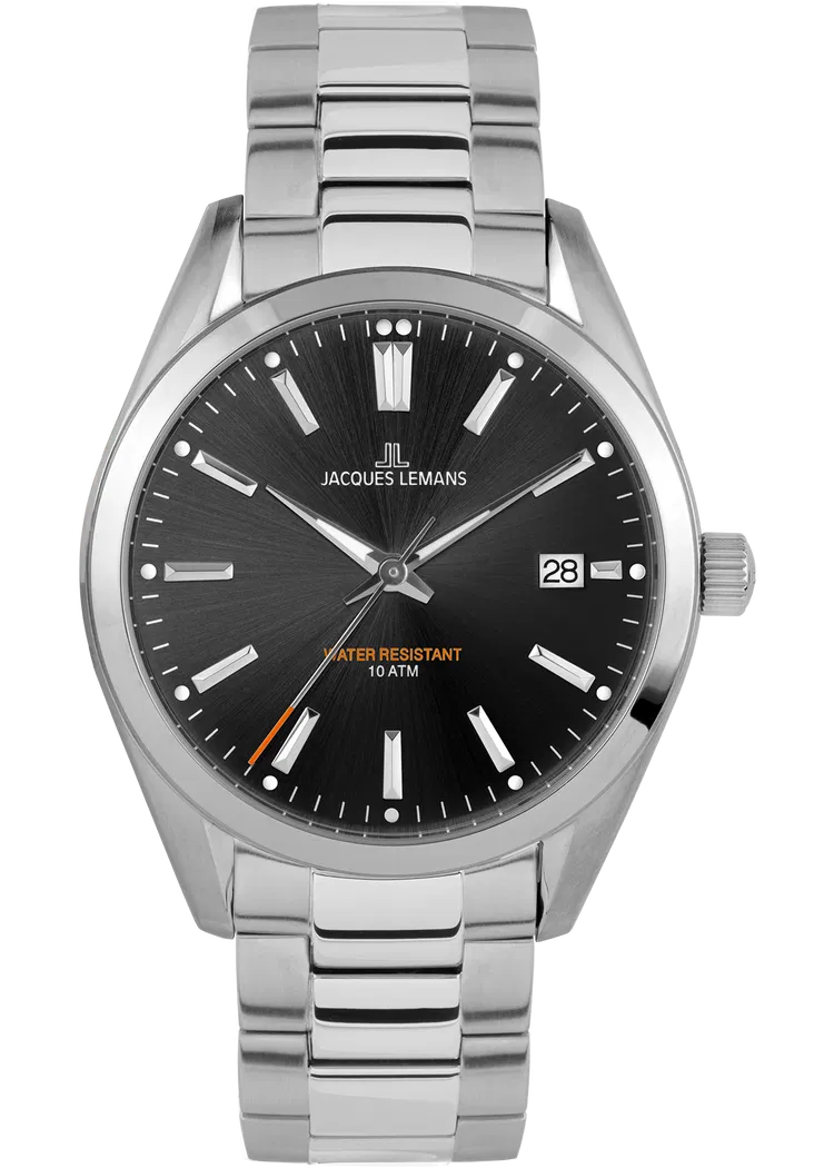 Тонкий стальной корпус мужских часов классической серии Jacques Lemans надежно защищает точный кварцевый механизм. Сразу привлекает внимание цвет полированного циферблата, выполненного в графитовом цвете. Помимо индикации времени (часовая, минутная, секундная стрелки), в положении «3» часа расположен индикатор даты. Обратите внимание на водостойкость. В данной модели она повышенная и составляет 10 АТМ. Часы дополняет стальной браслет.