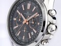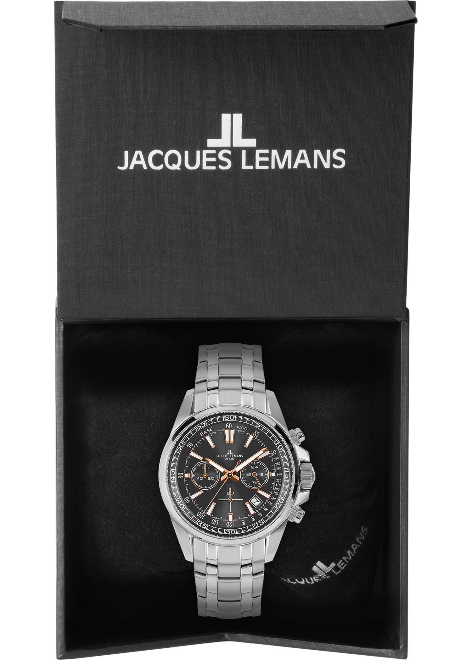 Новинка в знаменитой серии 1117 от Jacques Lemans: стильный кварцевый хронограф с повышенной водостойкостью 20 атмосфер, которую обеспечивают завинчивающаяся заводная головка и крышка. Массивный корпус диаметром 44 мм сделан из нержавеющей стали.