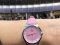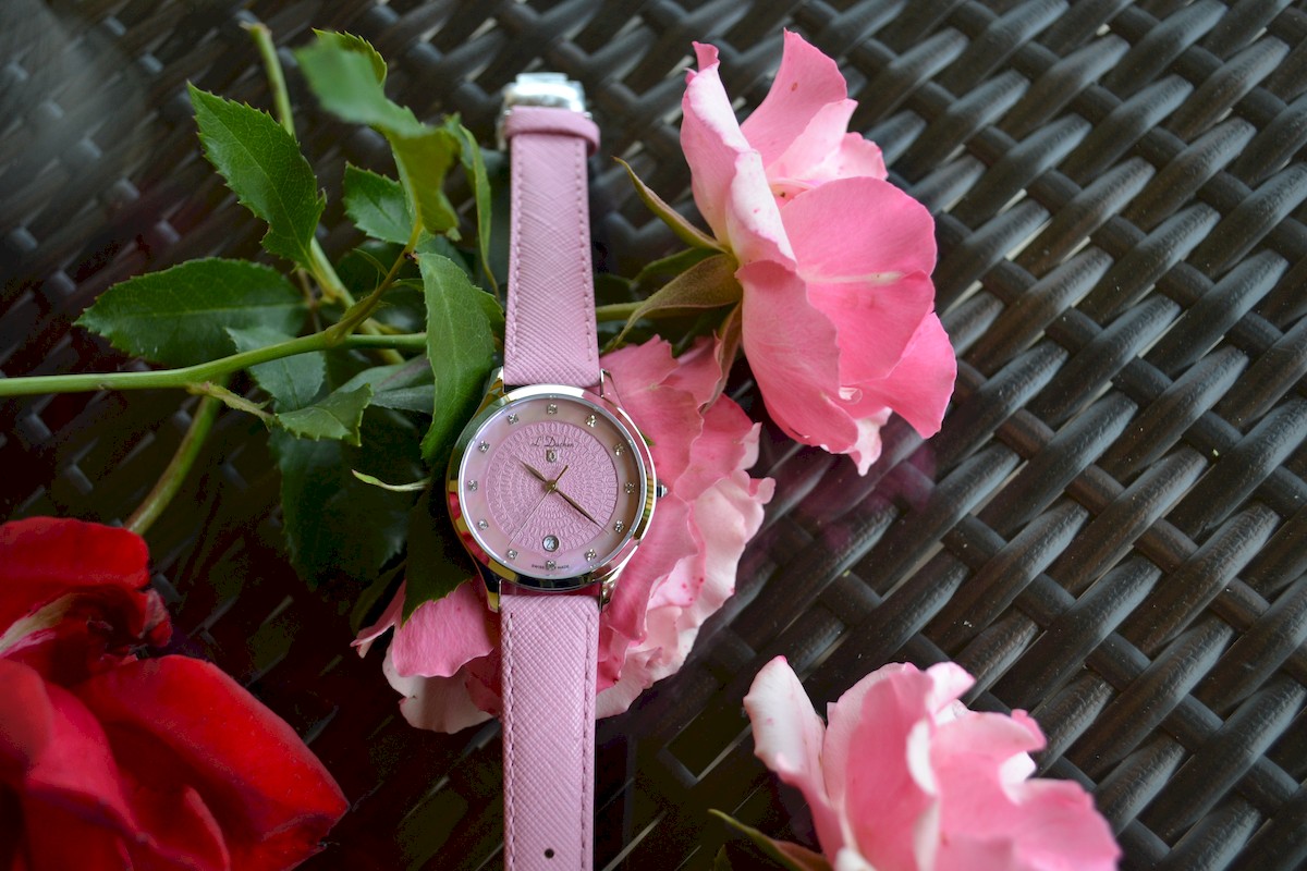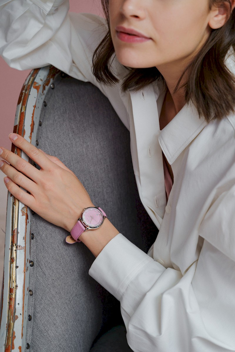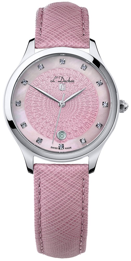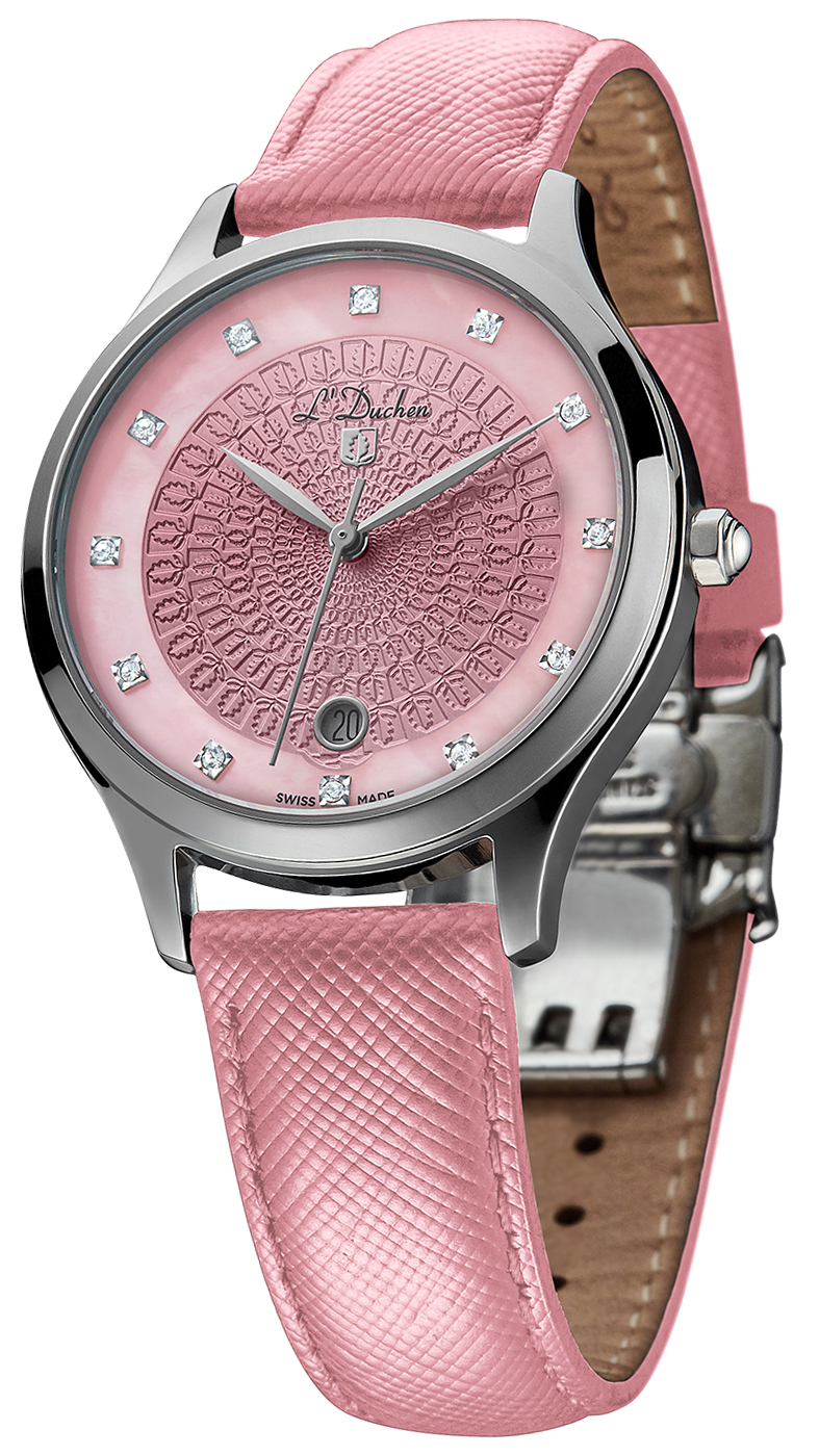 Стальной корпус с полированным безелем превосходно сочетается с ремешком из натуральной кожи, цвет которого перекликается с оттенком циферблата. Бесперебойную работу часов обеспечивает кварцевый швейцарский механизм.