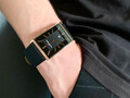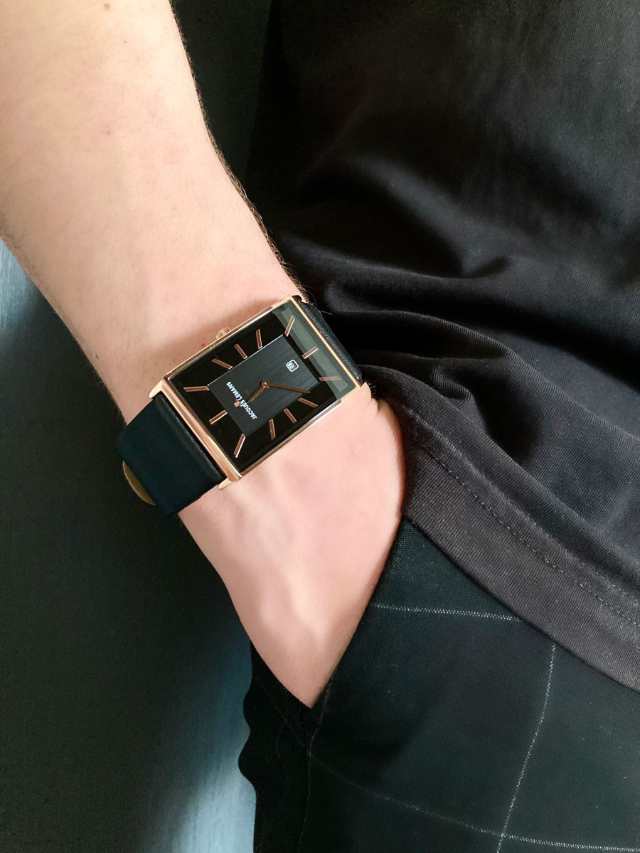 Классический прямоугольный корпус мужских часов слегка выгнут, что позволяет ему удобно прилегать к запястью. Корпус выполнен из нержавеющей стали с гипоаллергенными свойствами. На циферблате прямые линии хорошо читаемых стрелок указывают часы и минуты. В позиции «6 часов» расположен дополнительный индикатор даты. Циферблат защищен минеральным стеклом с сапфировым напылением, что повышает его ударопрочность и стойкость к появлению микроцарапин. Голубой циферблат часов дополняет широкий гладкий ремешок из натуральной кожи бежевого цвета, который мягко облегает запястье и позволяет коже дышать.