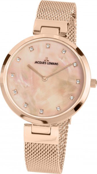 Женская модель из серии Jacques Lemans Milano впечатляет своим элегантным внешним видом. Классический корпус из прочной нержавеющей стали диаметром 36 мм украшен PVD-покрытием из розового золота. Он обрамляет красивый циферблат из перламутра розового оттенка, на котором расположены сверкающие кристаллы Swarovski. В часах c кварцевым механизмом установлено закаленное стекло Сrystex. Водонепроницаемость до 5ATM. Стальной браслет миланского плетения с PVD-покрытием идеально подчеркивает благородный внешний вид этих часов: классика, которая обязательно привлечет внимание.