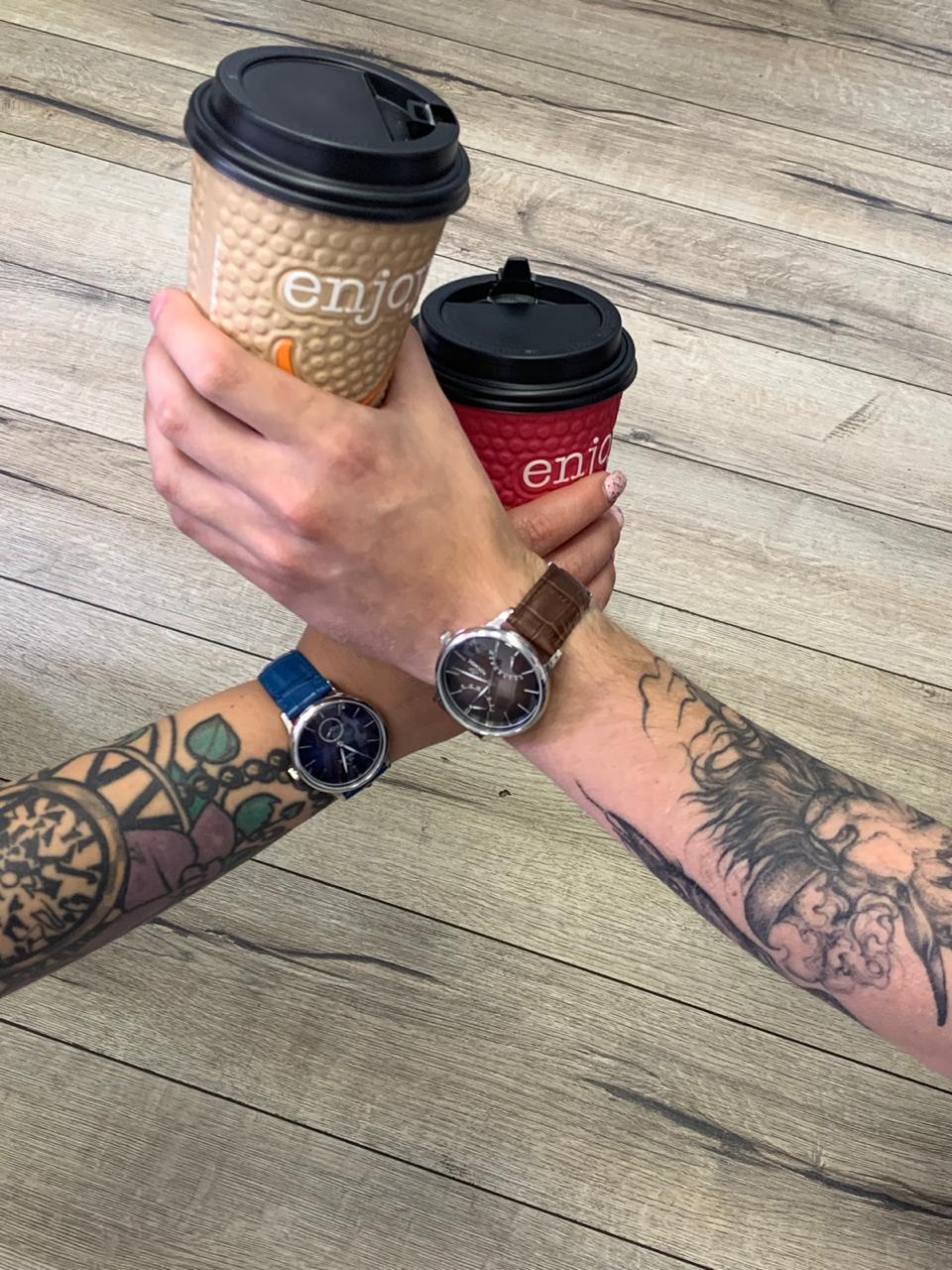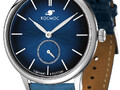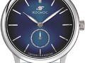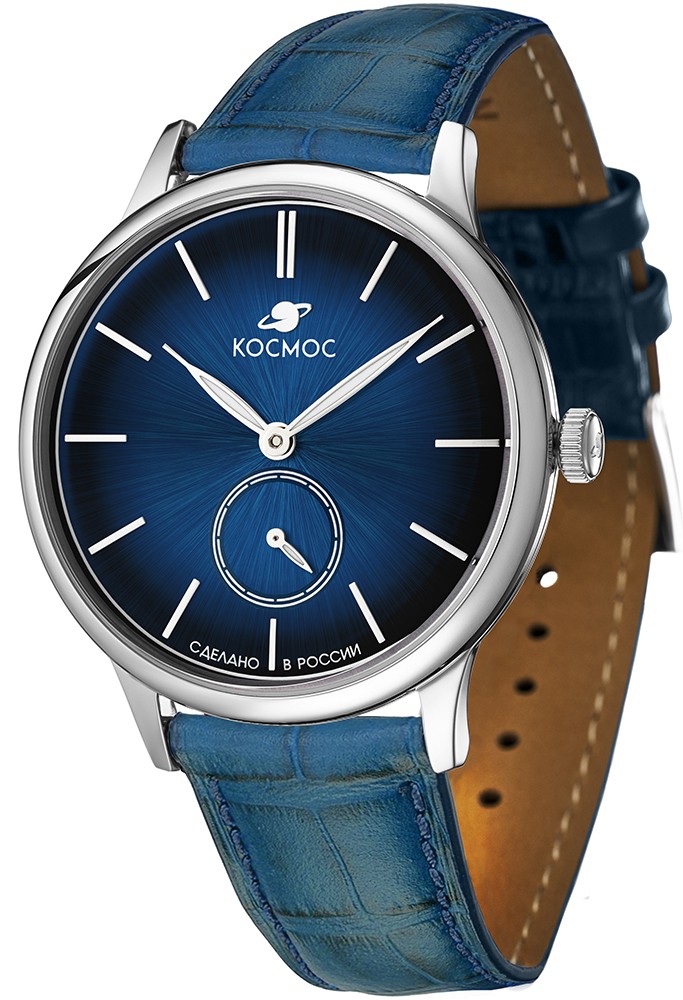 На стальной задней крышке выгравирован сюжет-фантазия о космическом будущем человека. Заводная головка украшена логотипом бренда: стилизованным изображением планеты с орбитой космического корабля. Часы установлены на синий ремешок из натуральной кожи с прошивкой.