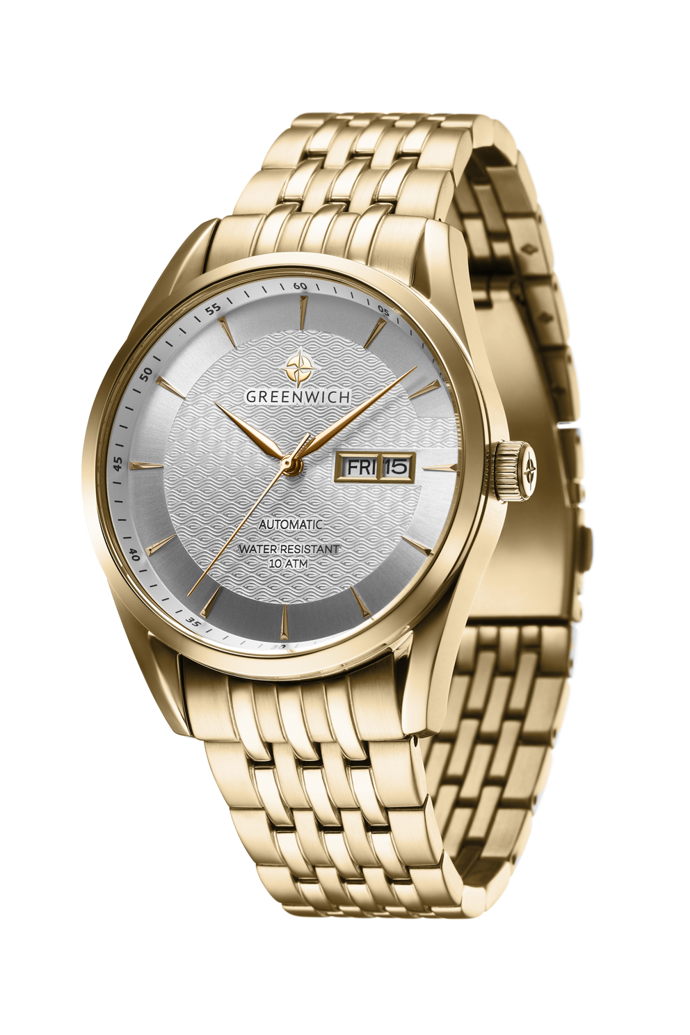 Серия Good Luck Classic входит в коллекцию автоматических часов бренда Greenwich. Классический корпус диаметром 42 мм с PVD-покрытием из желтого золота и безелем с зеркальной полировкой обрамляет серый циферблат часов. В центральной части циферблата — отличительная черта моделей этой серии: гильоше, объемные линии которого напоминают волны. Обратите внимание на форму пластины, где крепятся накладные риски: она сделана в форме латинской буквы G, первой буквы в названии бренда. Водостойкость равна 10 атмосфер: в этих часах можно плавать. Сквозь прозрачную заднюю крышку вы увидите детали механизма TMI с декорированным ротором: на нем выгравировано изображение символа английских моряков — парусника. Браслет и застежка-клипса выполнены из гипоаллергенной нержавеющей стали. Дизайн, актуальный для любого современного образа, и надежность используемых материалов делают автоматические часы Greenwich удобным и стильным аксессуаром на каждый день.