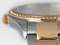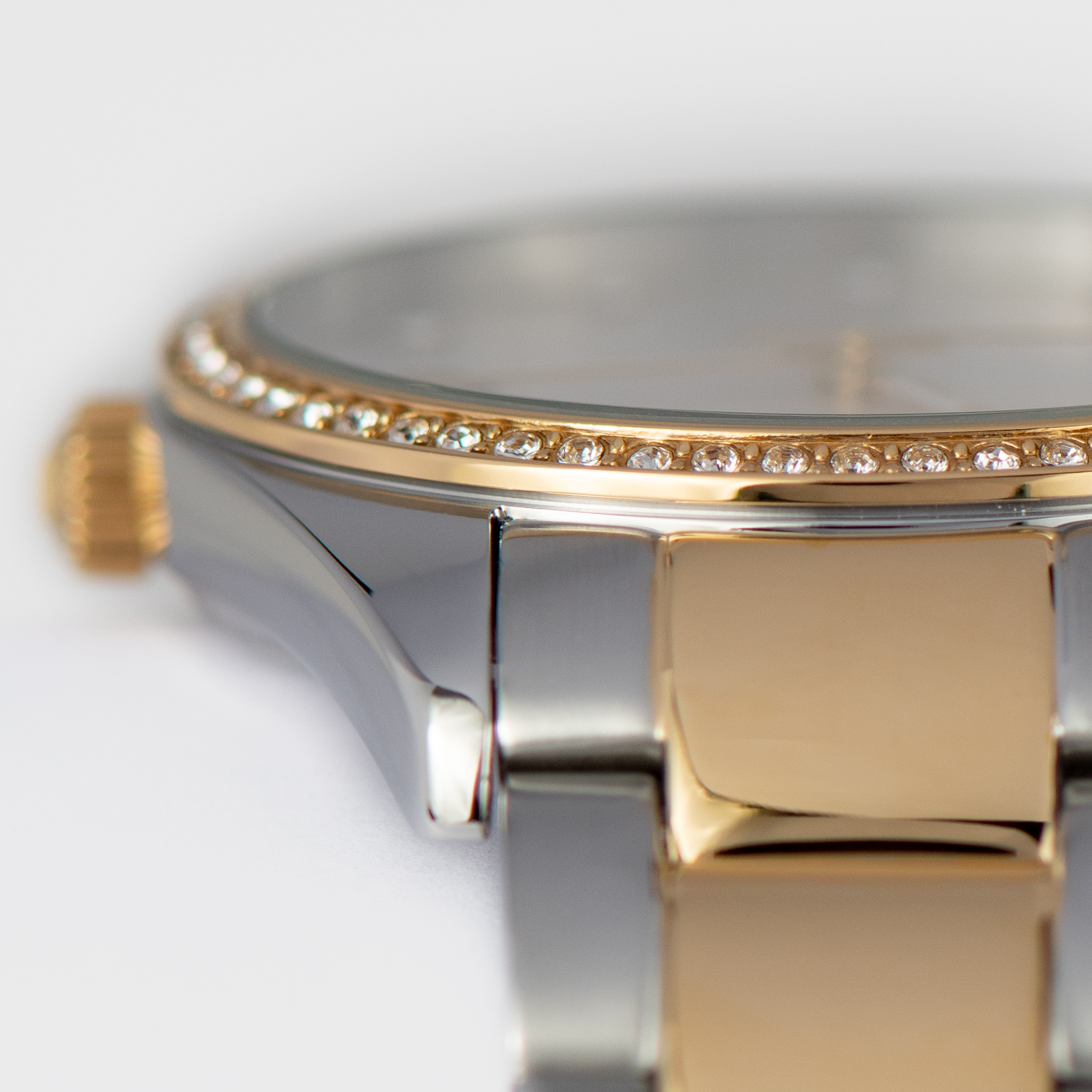 Классические часы серии Derby идеальны для современной жизни. Корпус модели диаметром 34 мм сделан из гипоаллергенной стали — этот материал удобен и безопасен для ежедневного использования. Безель выделен PVD-покрытием из желтого золота и сверкающими кристаллами Swarovski. Четкий циферблат белого цвета украшен полировкой в виде солнечных лучей и кристаллами Swarovski в роли индексов. Время легко определить при любых условиях видимости: люминесцентное покрытие часовой и минутной стрелок светится в темноте. Окошко даты размещено в положении «3 часа». В модели установлено ударопрочное минеральное стекло Crystex. Повышенная водостойкость равна 10 атмосфер. Застежка-клипса с логотипом бренда надежно удерживает браслет часов на запястье. Структуру браслета подчеркивает чередование стальных звеньев и звеньев с PVD-покрытием.