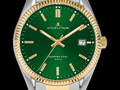 Выпуск этой серии посвящен 50-летию со дня основания бренда Jacques Lemans. Серьезная дата, которая говорит об успехе и десятилетиях накопленного опыта в производстве часов. Для модели 50-4 был выбран 34-миллиметровый корпус из нержавеющей стали с привлекающим внимание безелем. Рельеф, зеркальная полировка и PVD-покрытие из желтого золота, которыми он украшен, служат достойным обрамлением широкому циферблату зеленого цвета. На нем расположены четкие линии рисок и центральных стрелок. Стрелки часов и минут, а также риски будут хорошо читаться даже в темноте, благодаря тому, что они выделены люминесцентным покрытием. Кварцевый механизм часов предусматривает и индикацию текущей даты. Водостойкость равна 10 атмосфер. Браслет состоит из стальных звеньев и надежной застежки-клипсы с двумя боковыми кнопками и дополнительной защитой от случайного расстегивания.