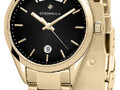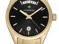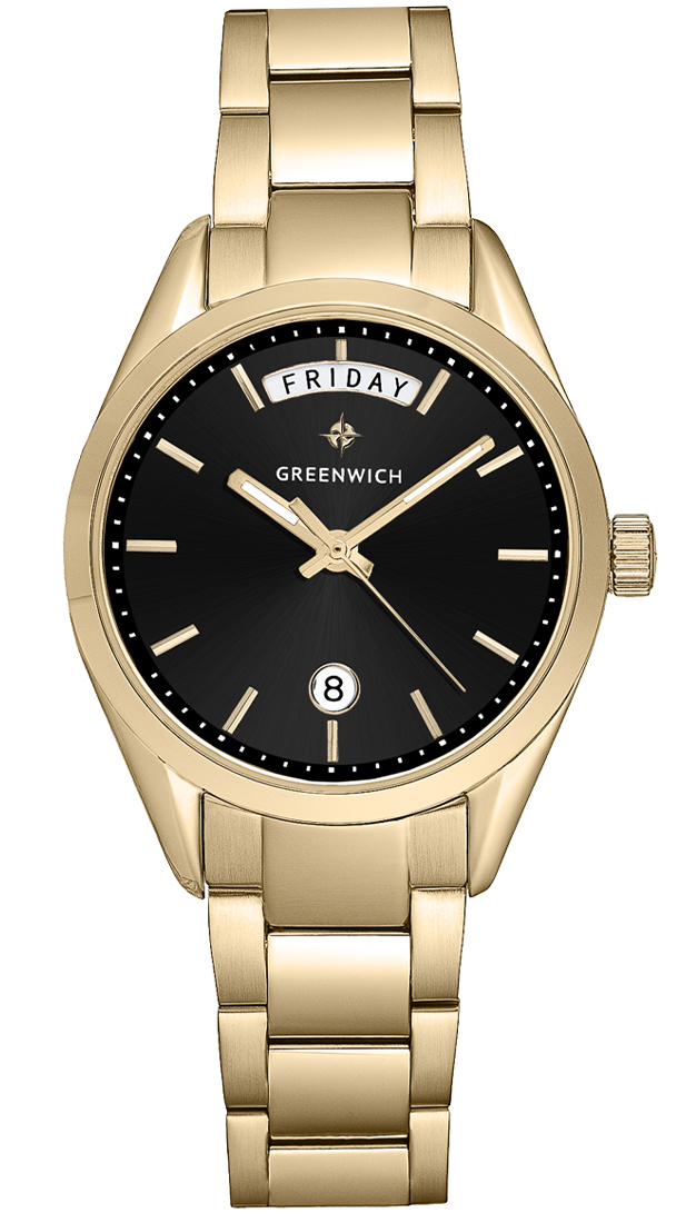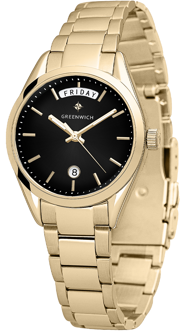 Новая коллекция Astrea от бренда Greenwich была названа в честь Астреи, древнегреческой богини точности. За точность в часах отвечает кварцевый механизм TMI, благодаря которому на черном циферблате отображается время (часы, минуты, секунды), дата и день недели. Обратите внимание на индикатор дня недели: он достаточно широкий, чтобы вместить название дня полностью, что, конечно, улучшает восприятие информации. Круглый корпус диаметром 34 мм сделан из нержавеющей стали с PVD-покрытием из желтого золота, как и литой браслет с надежной застежкой-клипсой. Повышенная водостойкость равна 10 атмосфер. Часы Astrea хорошо сочетаются с повседневными образами, а из-за лаконичного размера корпуса модель изящно смотрится на любом запястье.