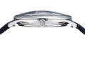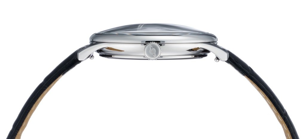 Хорошо читаются крупные часовая и минутная стрелки. Индикация секунд вынесена в нижнюю часть циферблата. На стальной задней крышке выгравирован сюжет-фантазия о космическом будущем человека. Заводная головка украшена логотипом бренда: стилизованным изображением планеты с орбитой космического корабля. Часы установлены на черный ремешок из натуральной кожи с прошивкой.