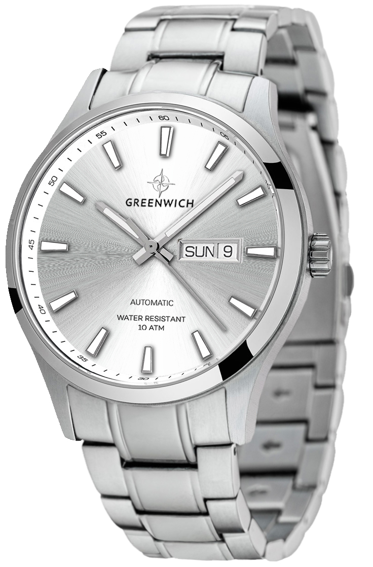 Премьерную коллекцию автоматических часов бренда Greenwich открывает серия Good Luck. Классический корпус диаметром 43 мм с полированным безелем обрамляет циферблат часов. Полировка в виде солнечных лучей и крупные риски, сдвоенное окошко даты и люминесцентное покрытие часовой и минутной стрелок: серебристый циферблат эффектно смотрится, функционален и легко читается при любом освещении. Водостойкость равна 10 атмосфер: в этих часах можно плавать. Сквозь прозрачную заднюю крышку вы увидите детали механизма TMI с декорированным ротором: на нем выгравировано изображение символа английских моряков — парусника и название коллекции. Браслет и застежка-клипса выполнены из гипоаллергенной нержавеющей стали. Дизайн, актуальный для любого современного образа, и надежность используемых материалов делают автоматические часы Greenwich удобным и стильным аксессуаром на каждый день.