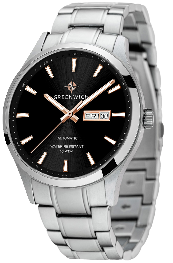 Премьерную коллекцию автоматических часов бренда Greenwich открывает серия Good Luck. Классический корпус диаметром 43 мм с полированным безелем обрамляет циферблат часов. Полировка в виде солнечных лучей и крупные риски, сдвоенное окошко даты и люминесцентное покрытие часовой и минутной стрелок: черный циферблат эффектно смотрится, функционален и легко читается при любом освещении. Стрелки и риски выделены PVD-покрытием из розового золота. Водостойкость равна 10 атмосфер: в этих часах можно плавать. Сквозь прозрачную заднюю крышку вы увидите детали механизма TMI с декорированным ротором: на нем выгравировано изображение символа английских моряков — парусника и название коллекции. Браслет и застежка-клипса выполнены из гипоаллергенной нержавеющей стали. Дизайн, актуальный для любого современного образа, и надежность используемых материалов делают автоматические часы Greenwich удобным и стильным аксессуаром на каждый день.